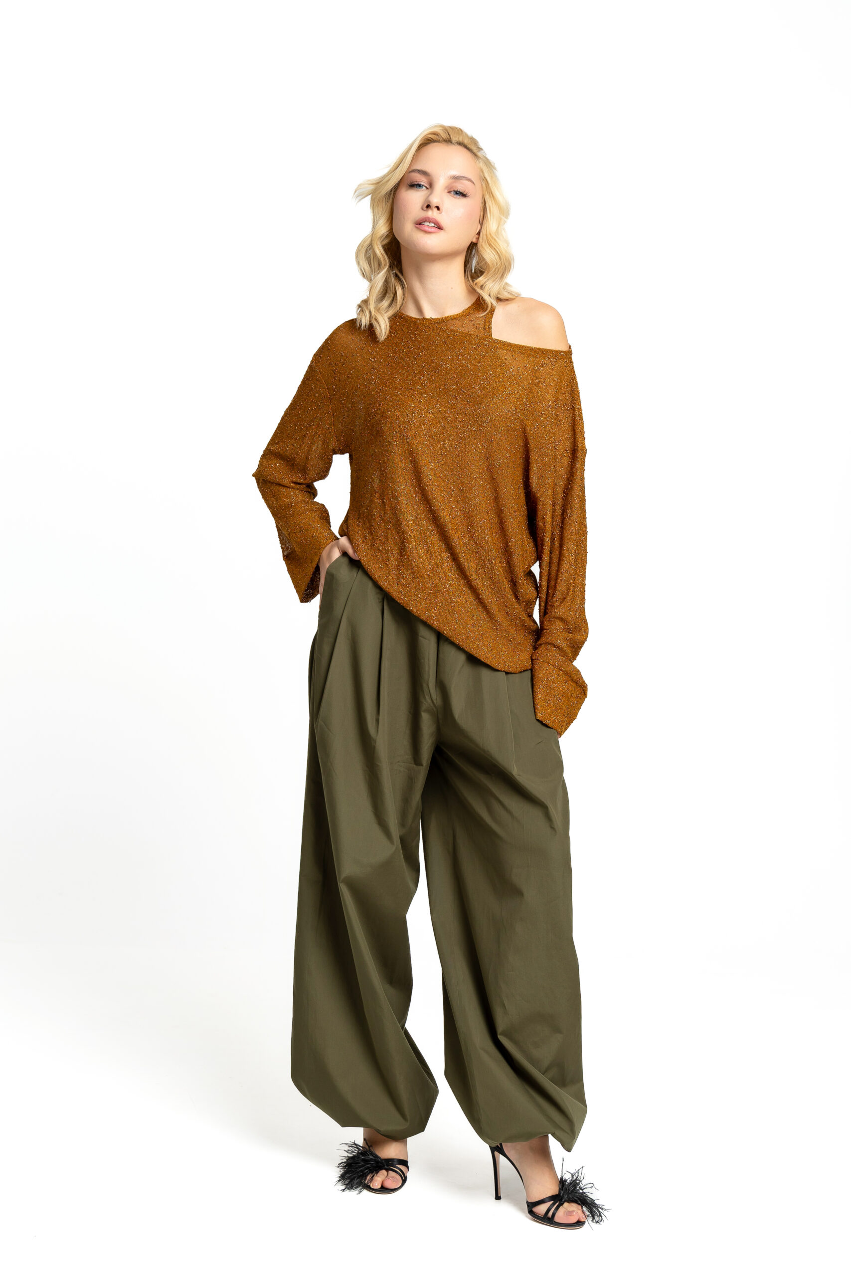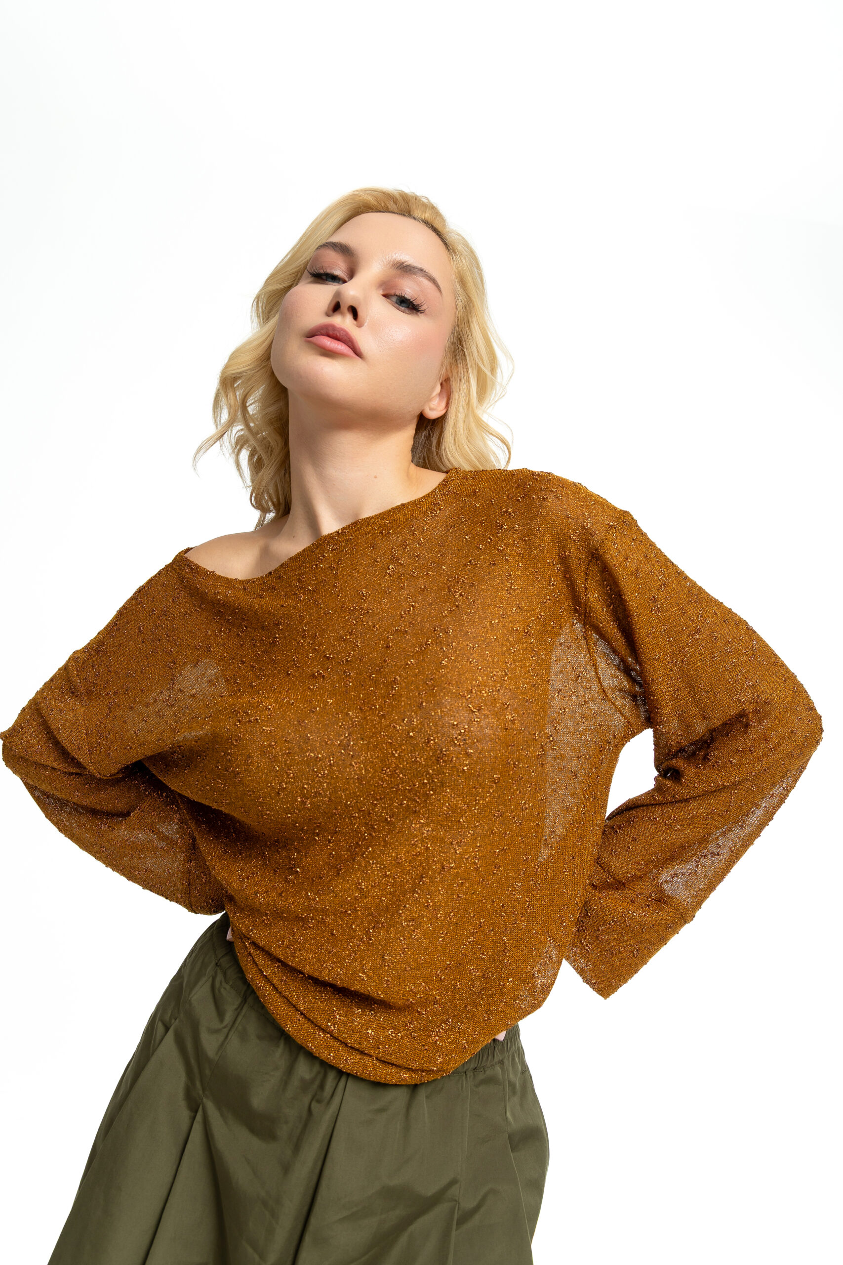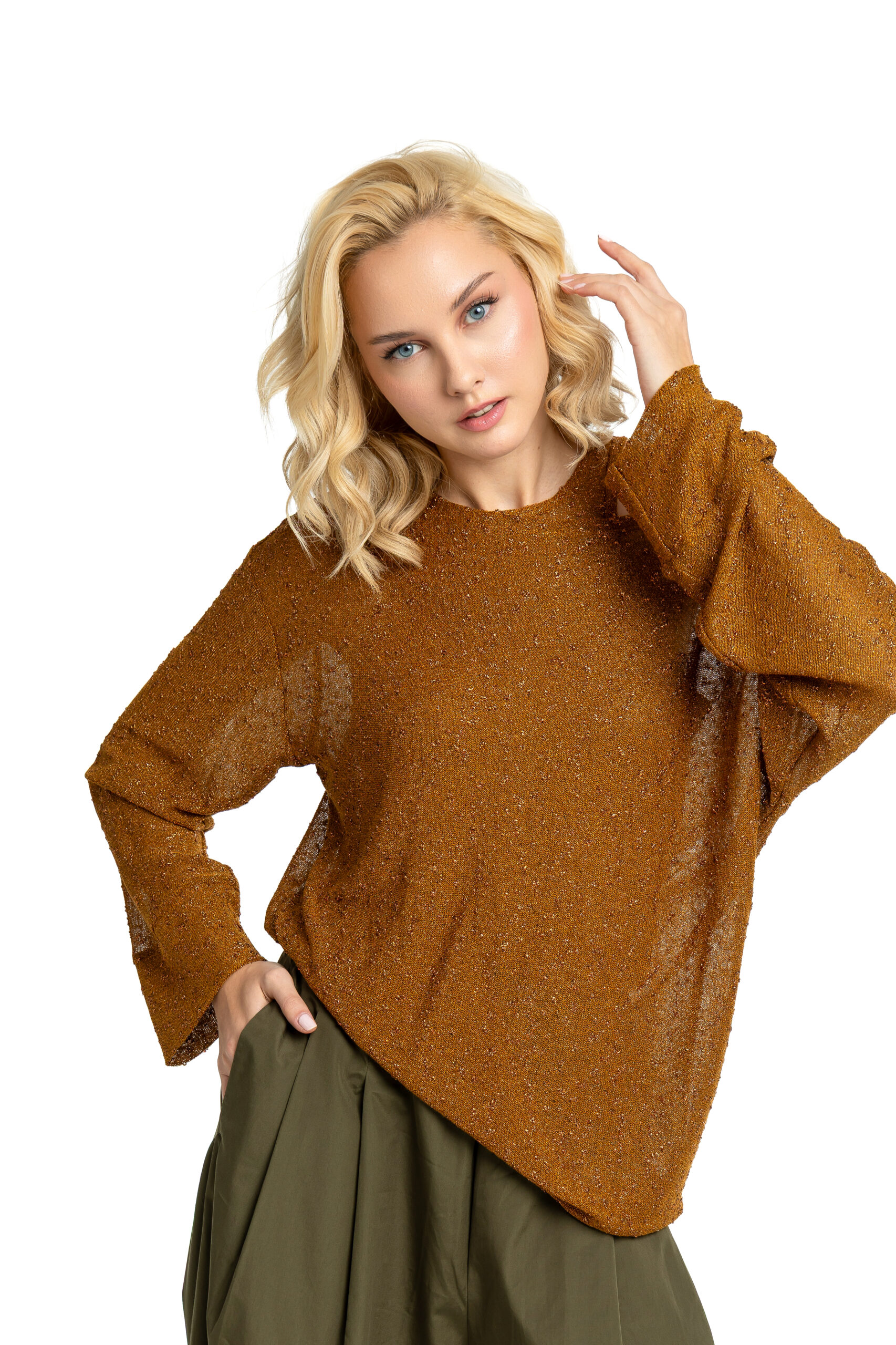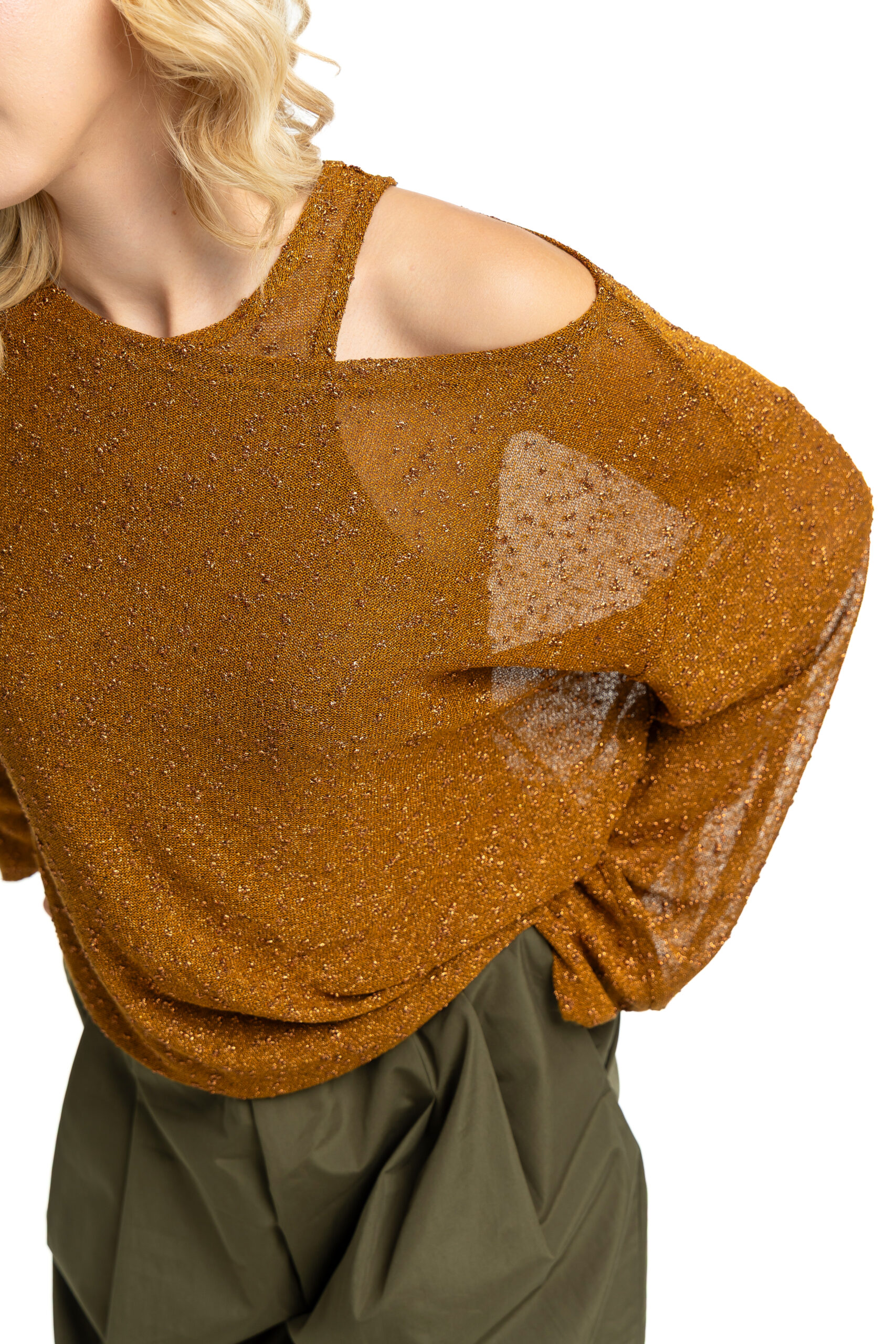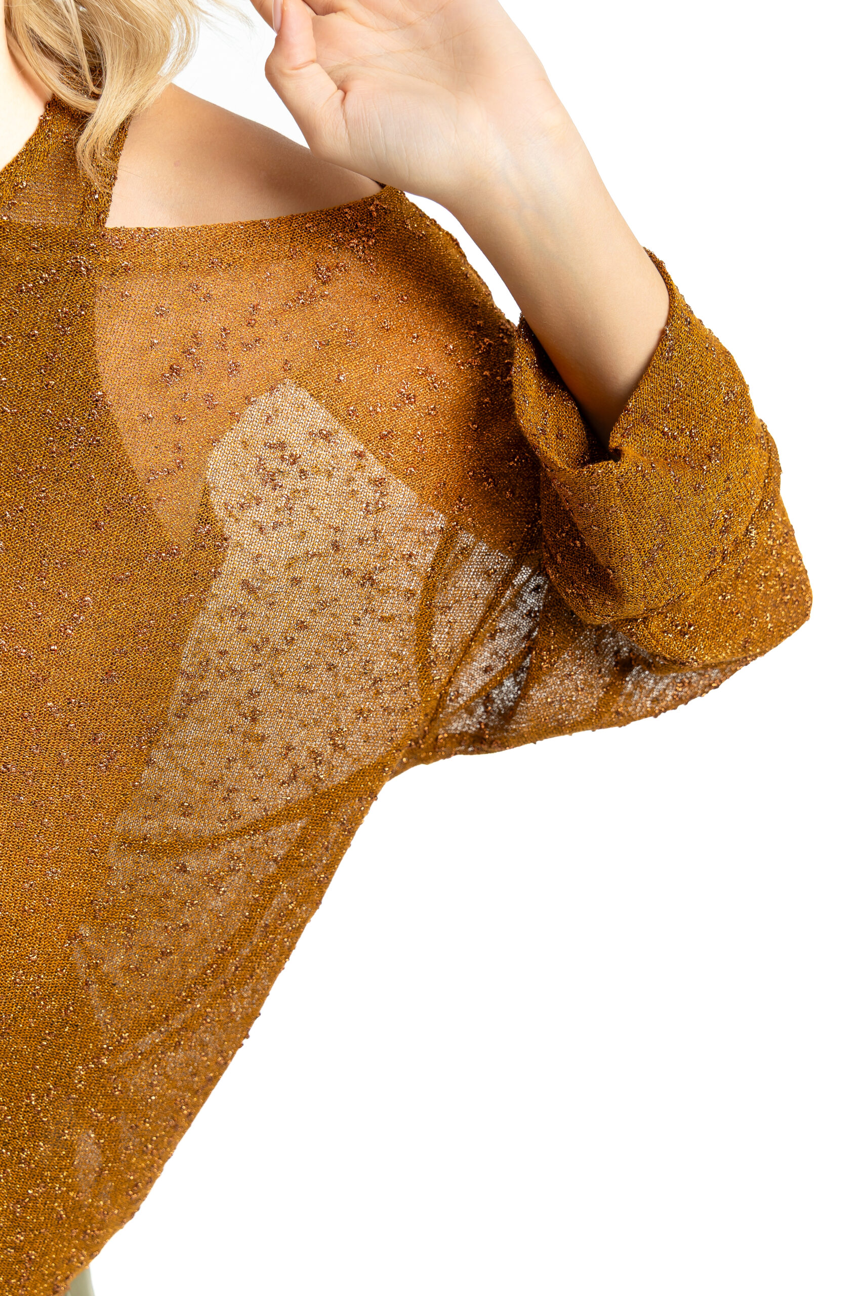 A relaxed-fit blouse  in a bronze tone, crafted from a lightweight, semi-sheer fabric composed of