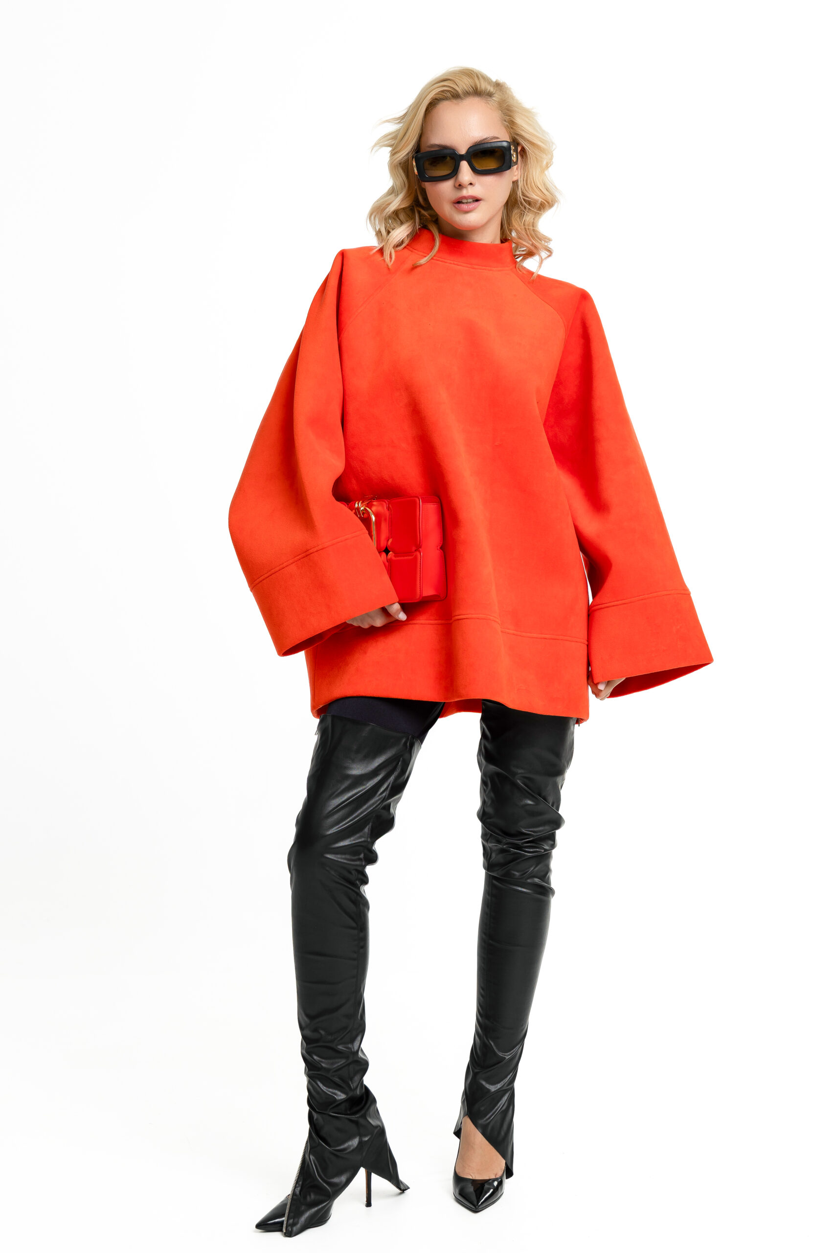 A clean hemline stabilizes the volume, maintaining balance between structure and softness. The sweatshirt functions as a standalone statement — warm, tactile, and precisely shaped.