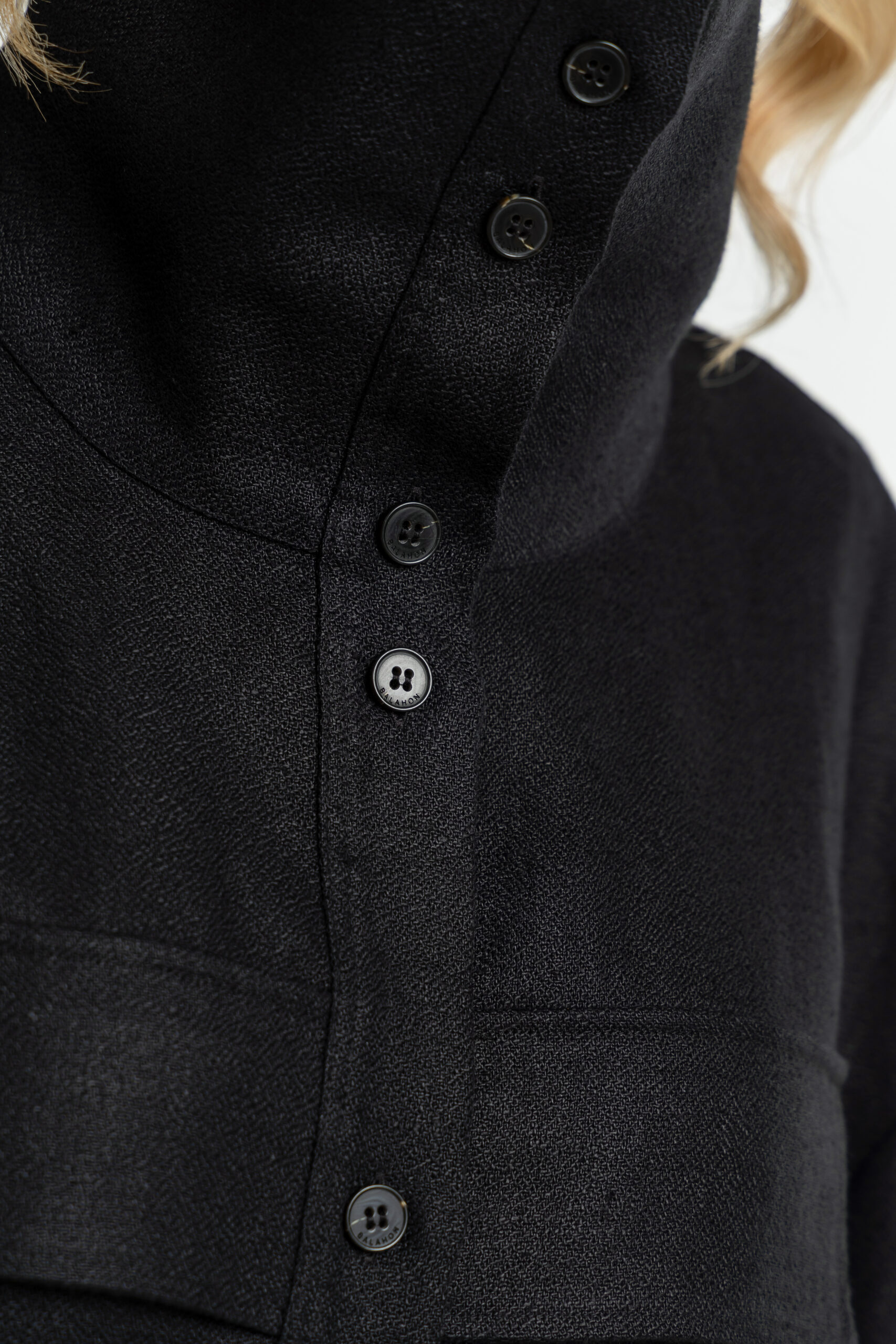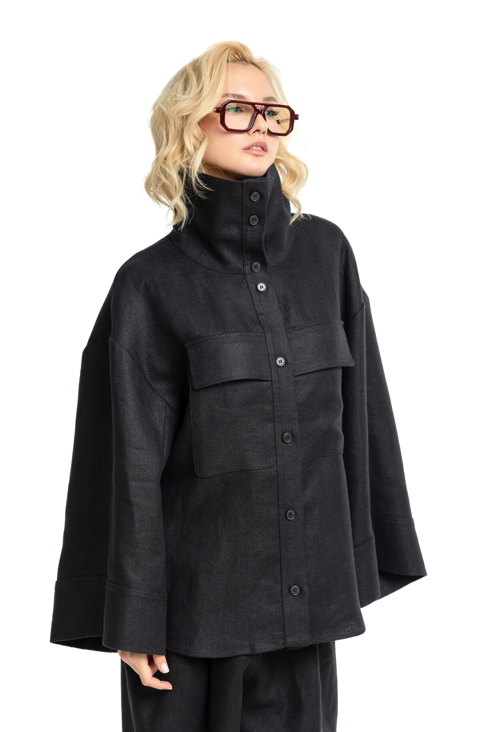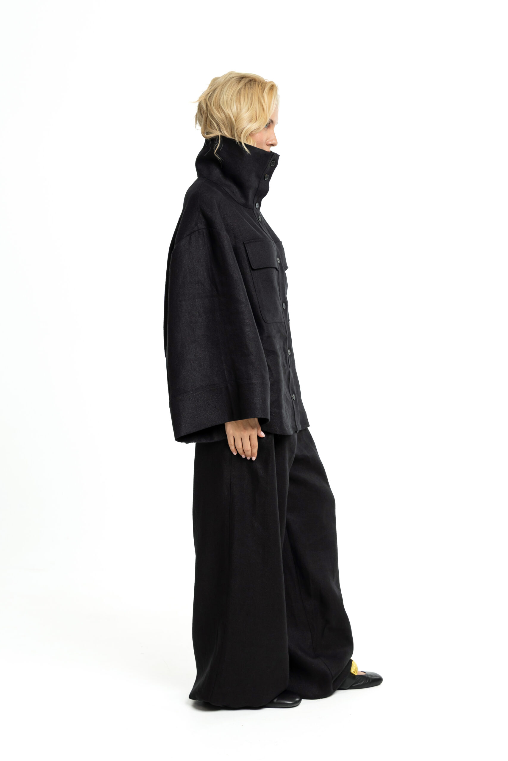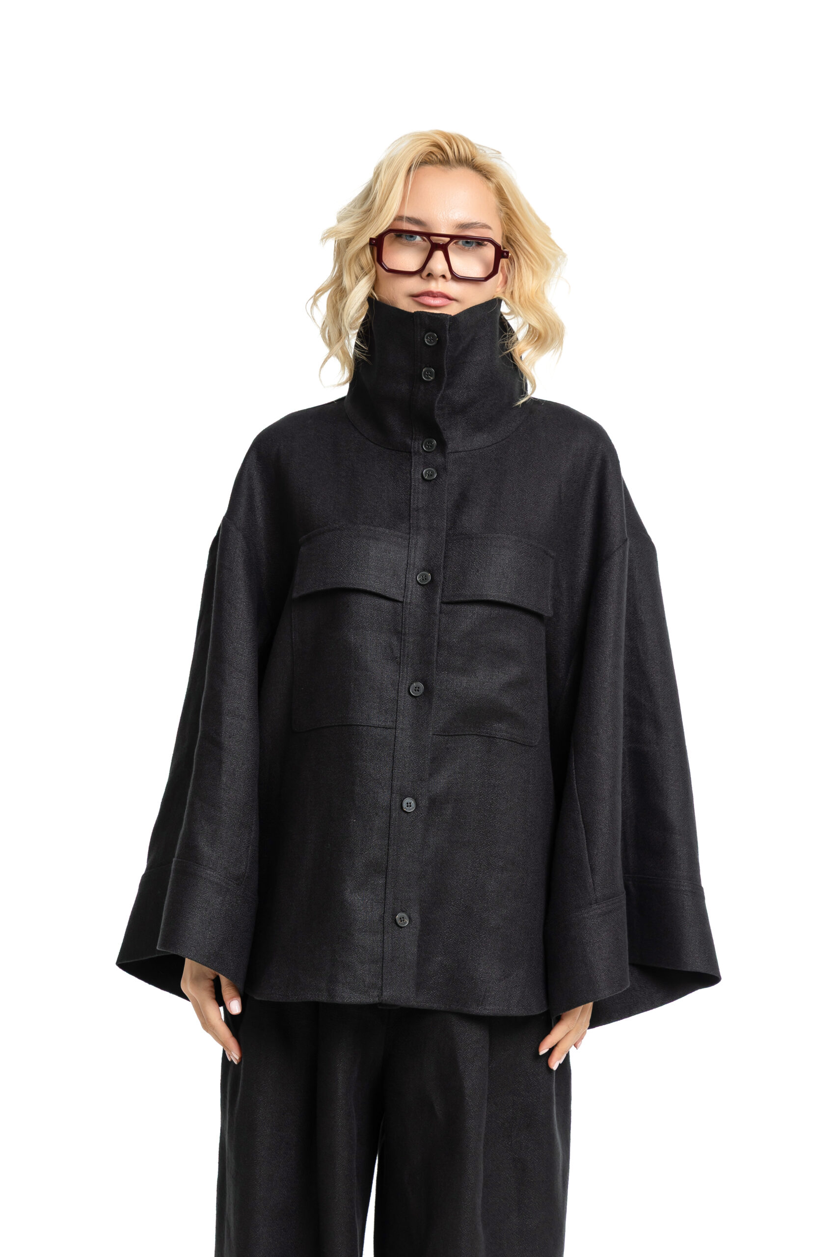 A relaxed, voluminous shirt crafted from 100% linen, in black. The natural fabric with a pronounced texture emphasizes the architectural quality of the form and gives the garment a sense of structure and composure.