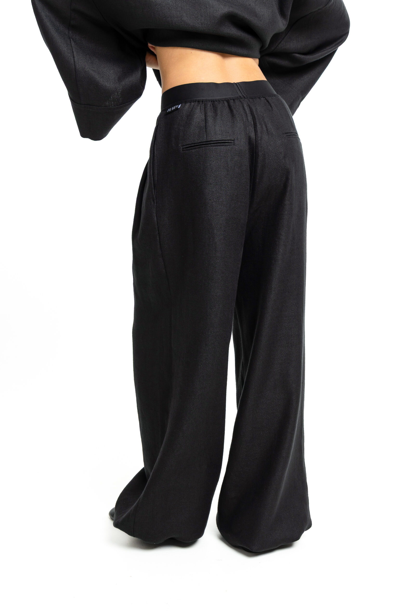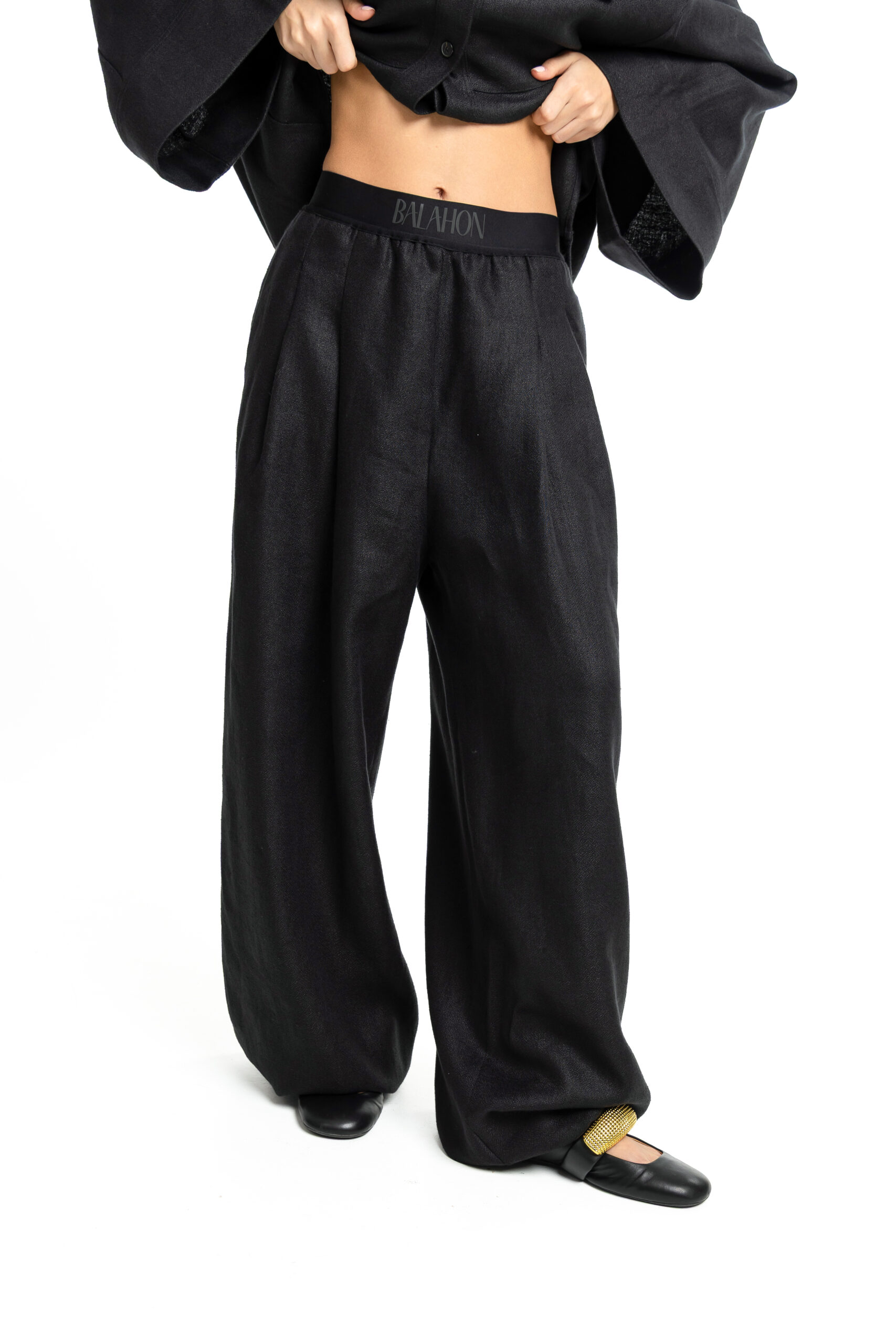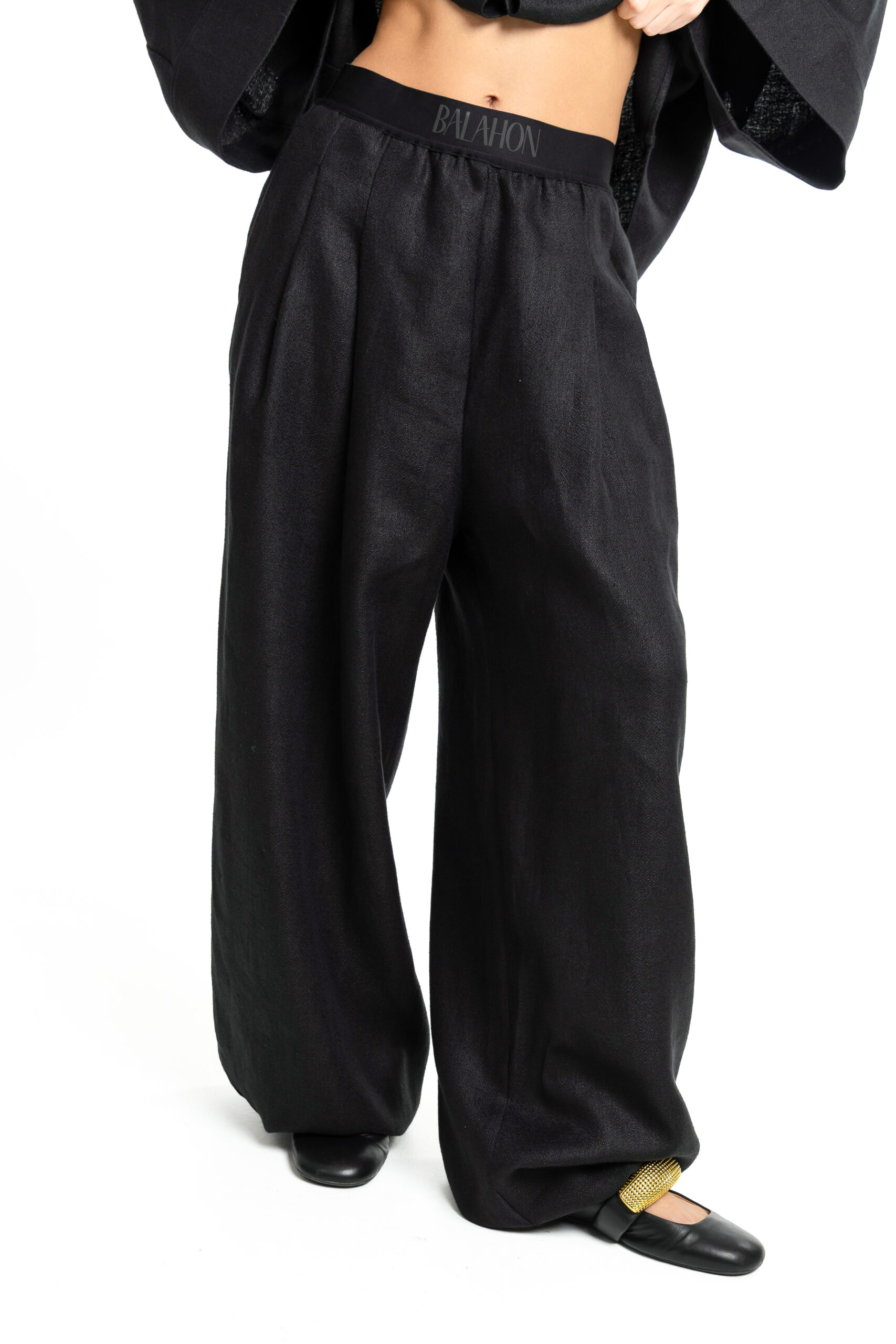 Relaxed straight-leg trousers crafted from 100% linen with a weight of 330 g/m², in black. The natural fabric has a pronounced texture that gives the garment a sense of weight and stability while remaining breathable and comfortable to wear.