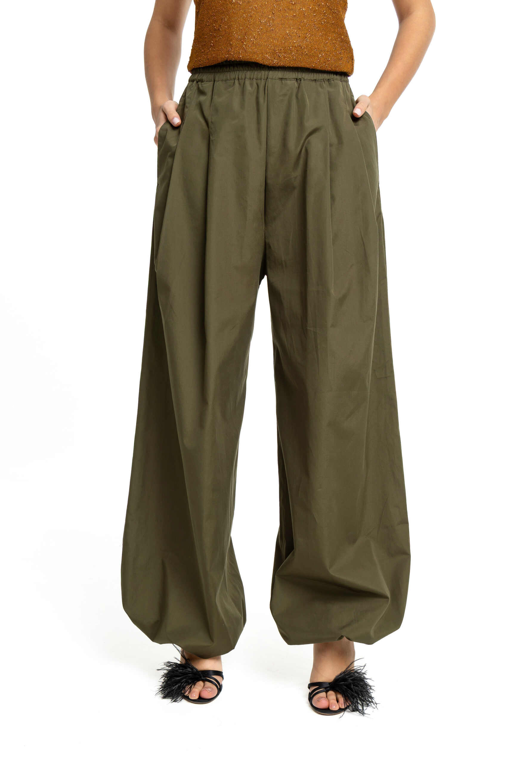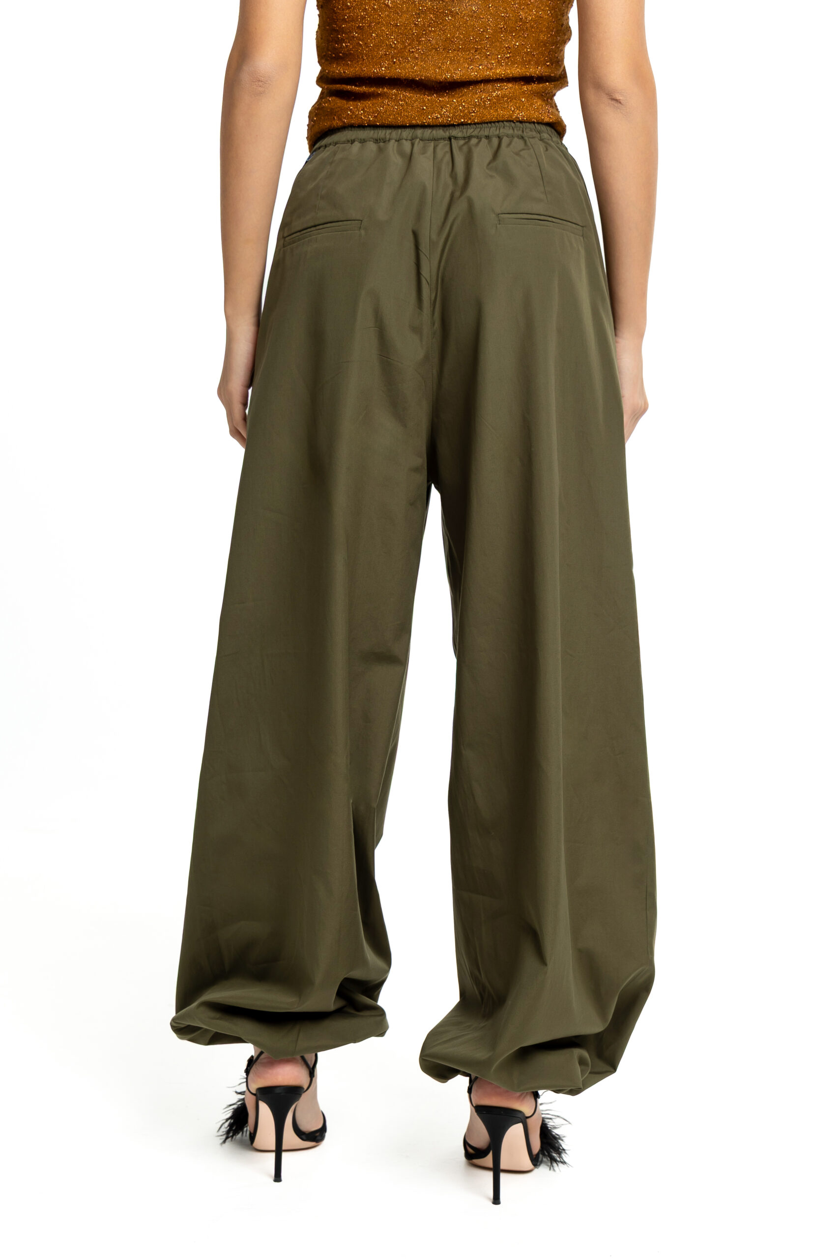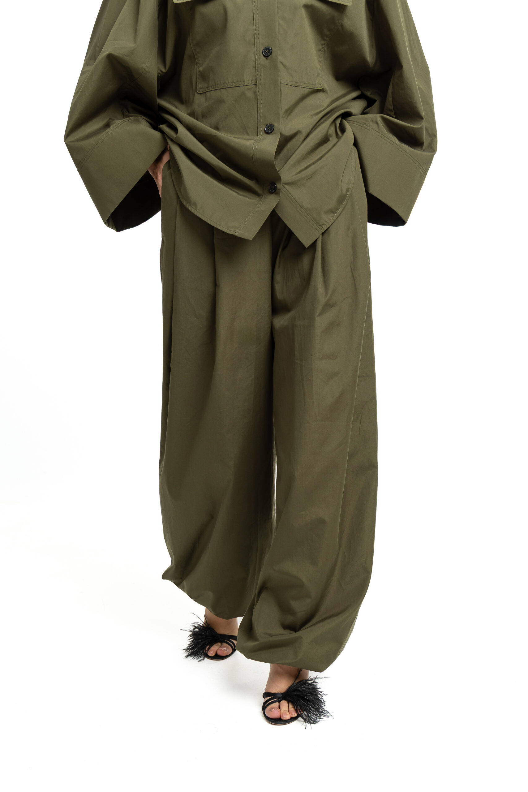 Wide-leg trousers with a soft, voluminous silhouette, crafted from fine 100% cotton with a weight of 108 g/m², in khaki. The lightweight fabric features a subtle, refined sheen, enhancing the fluidity of the form while remaining comfortable to wear.