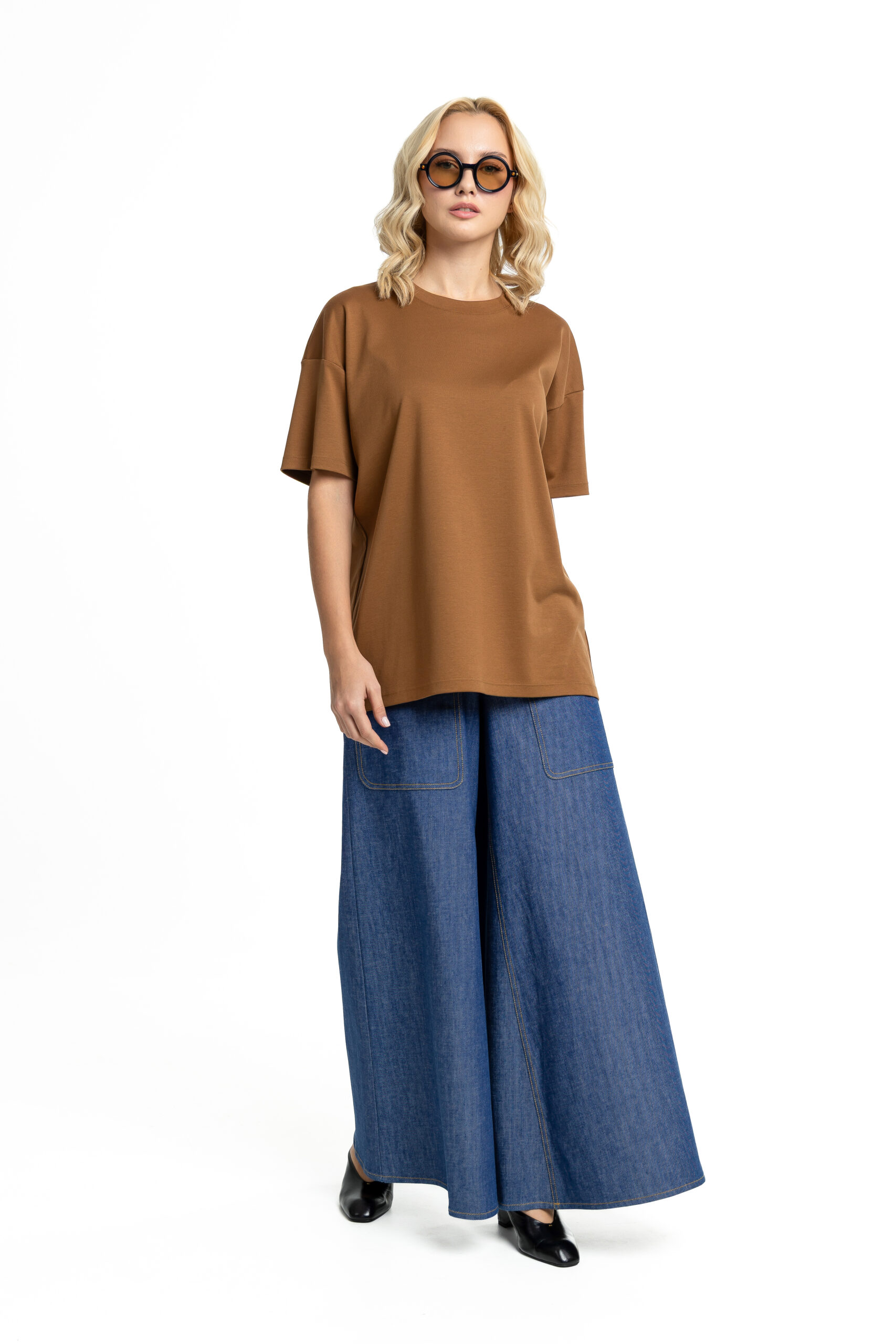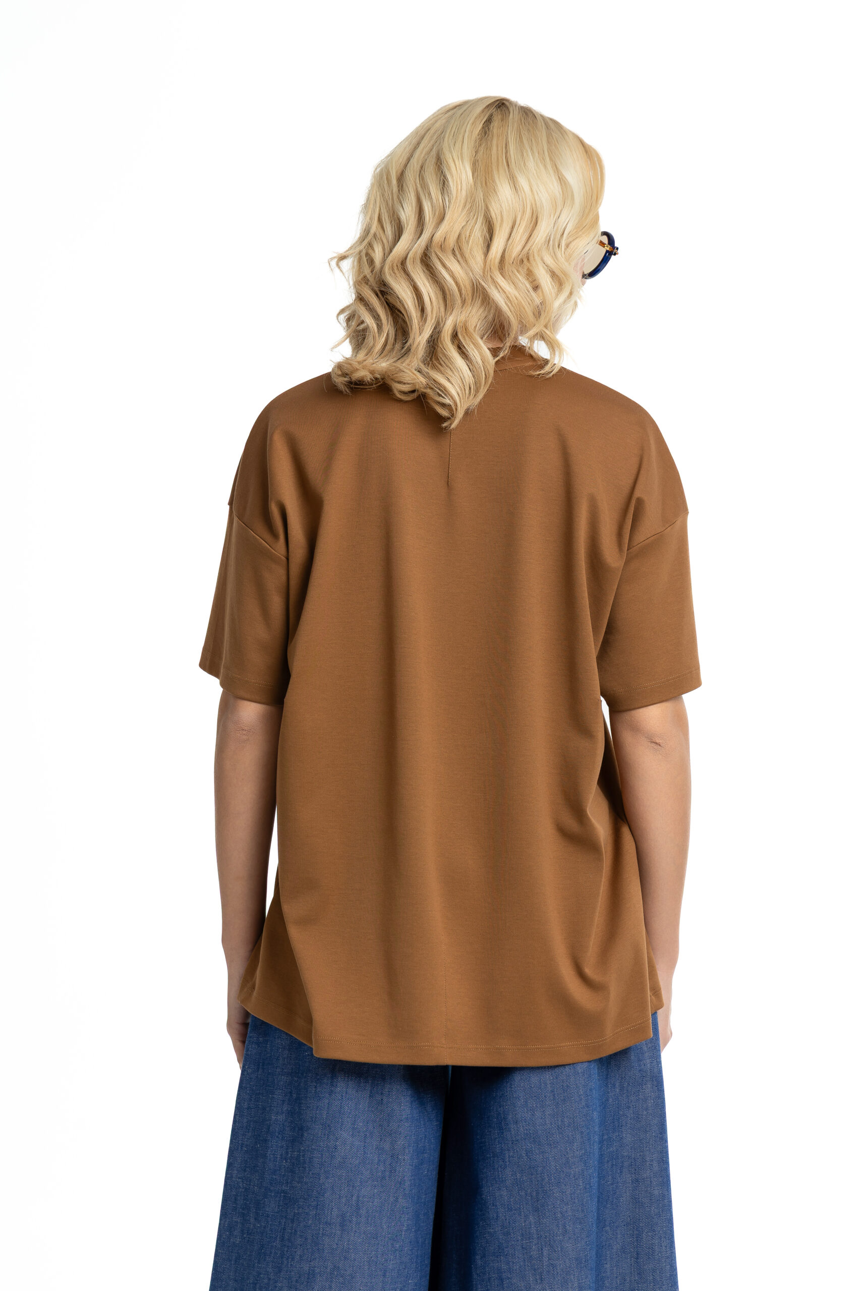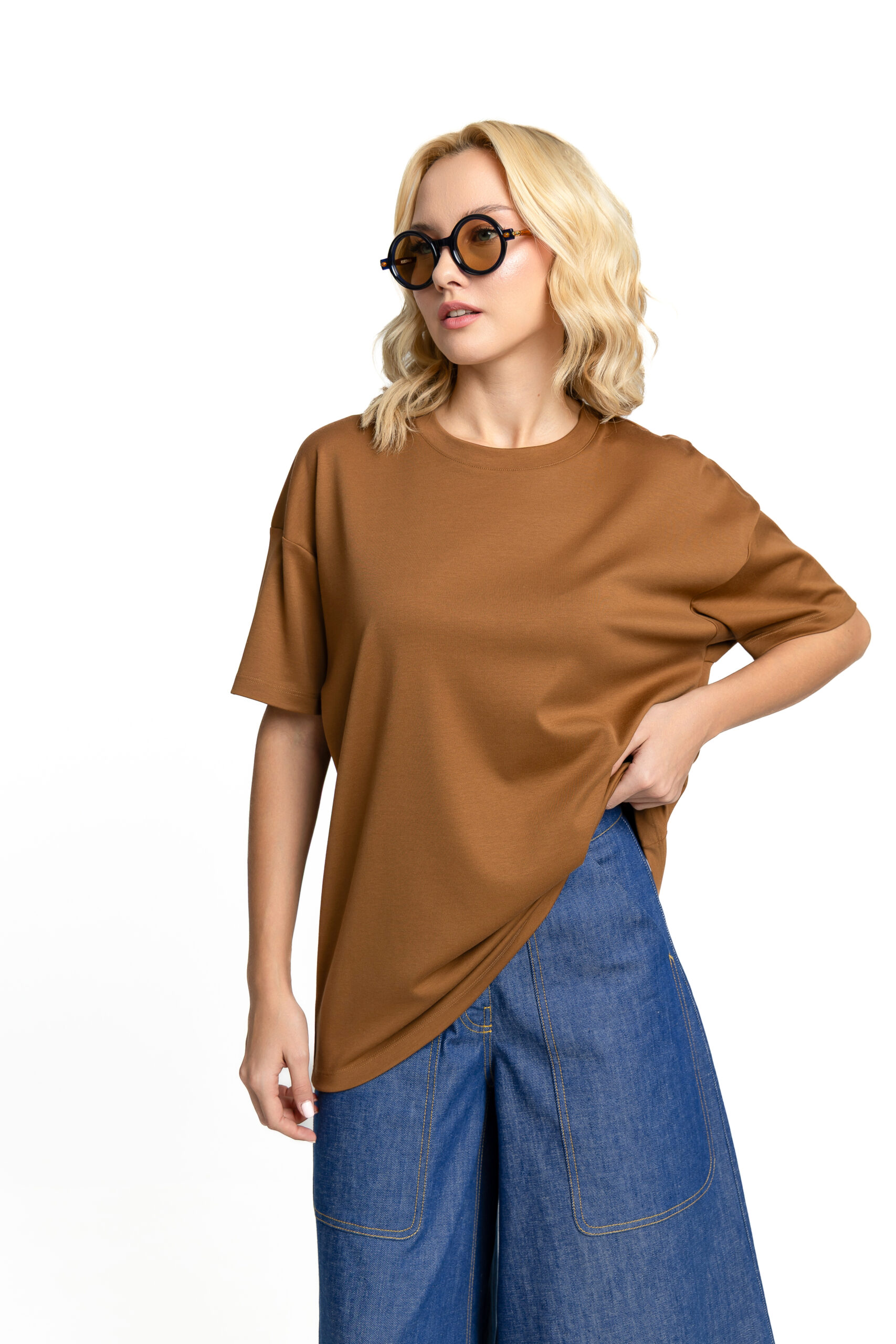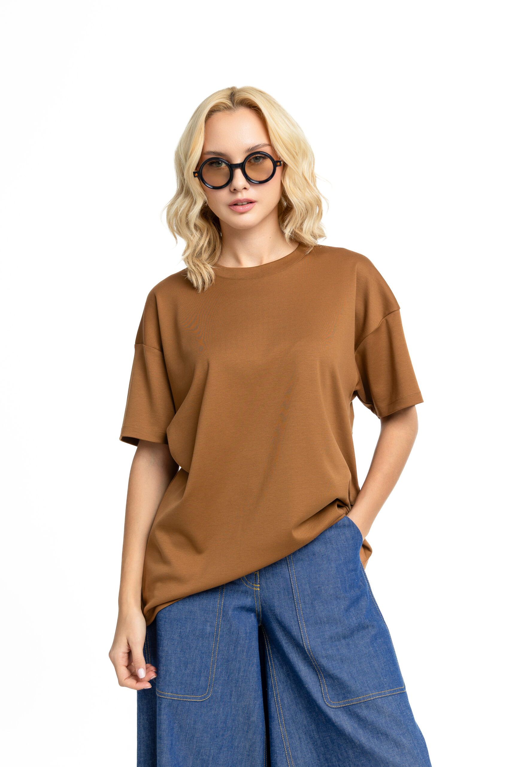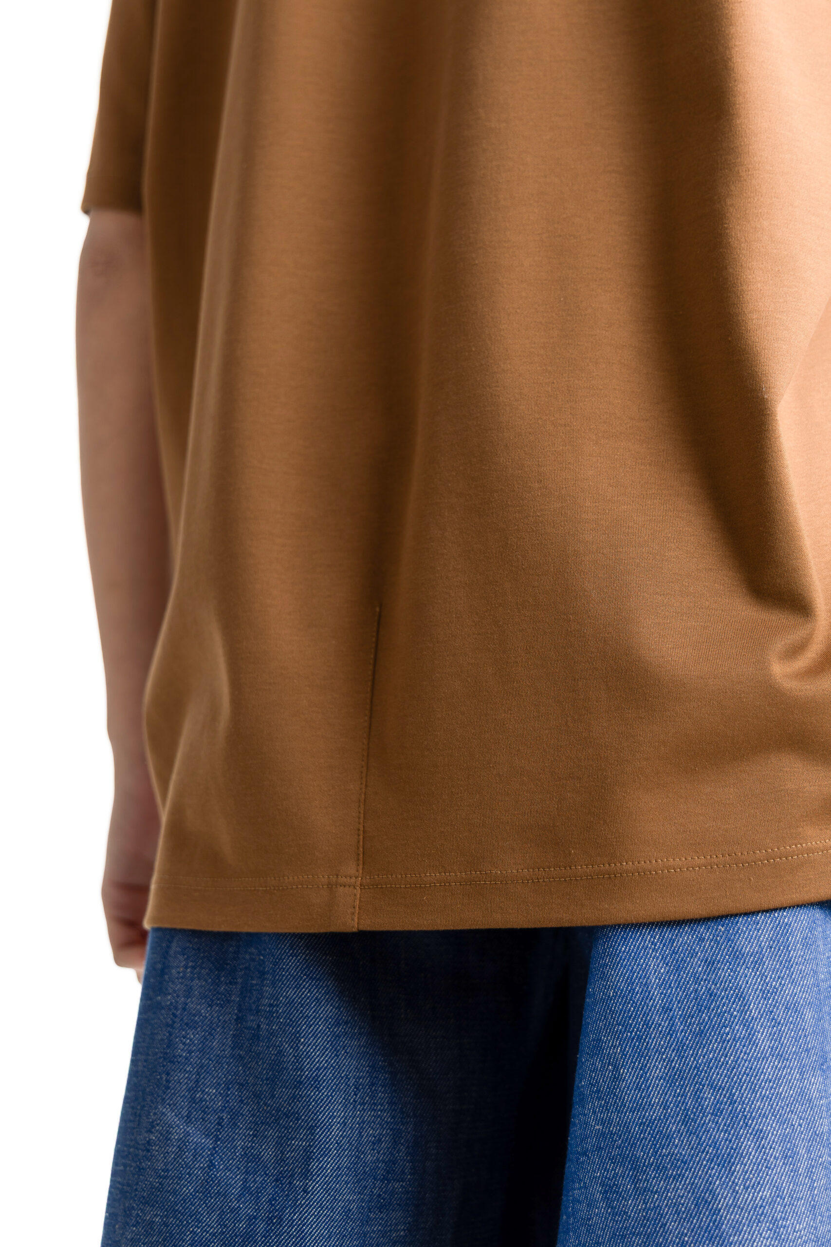 A relaxed straight-cut T-shirt with a round neckline, crafted from 100% cotton with a weight of 200 g/m², in camel. The dense yet soft fabric holds its shape well while remaining comfortable for everyday wear.