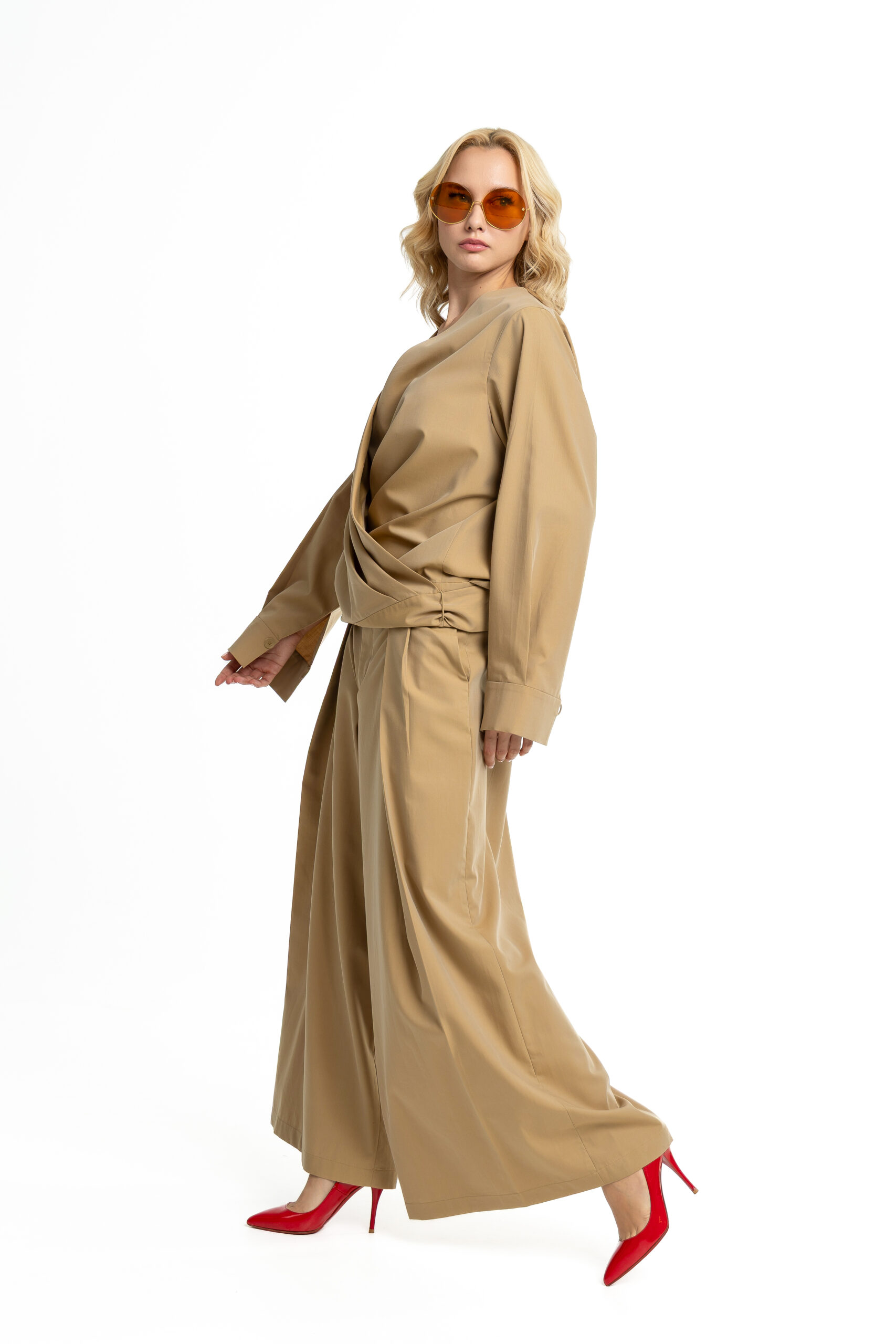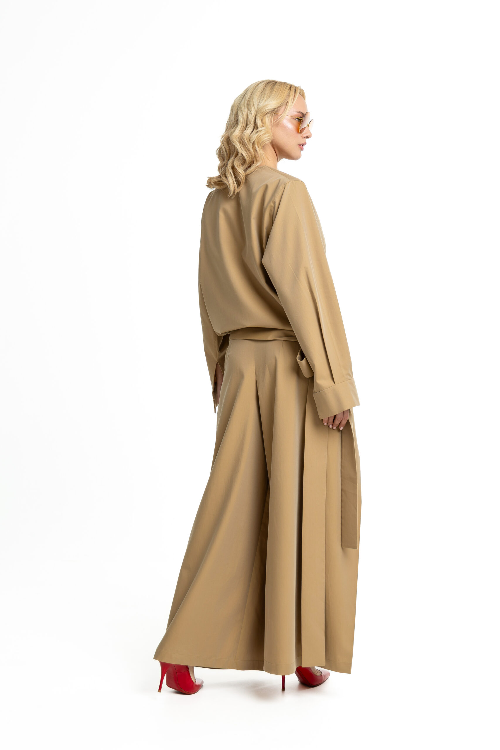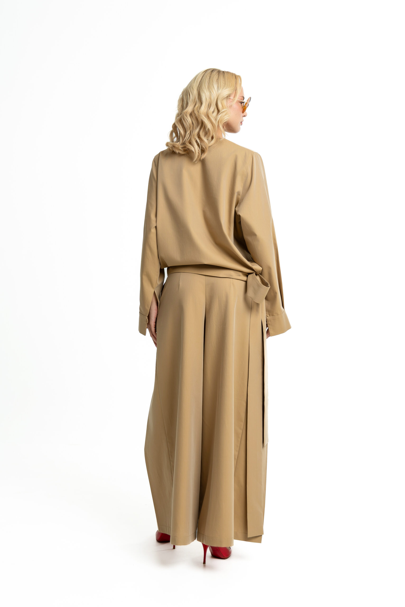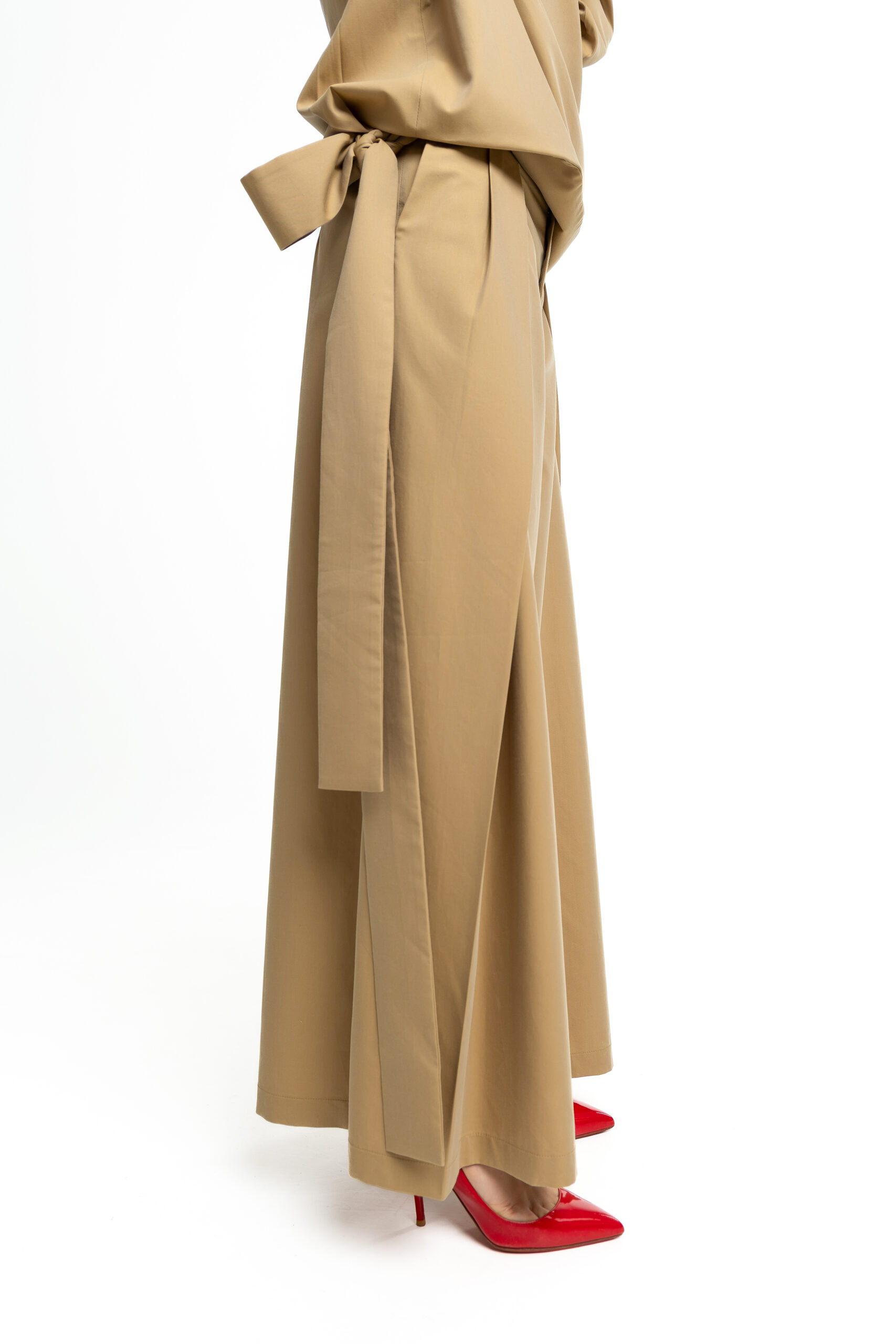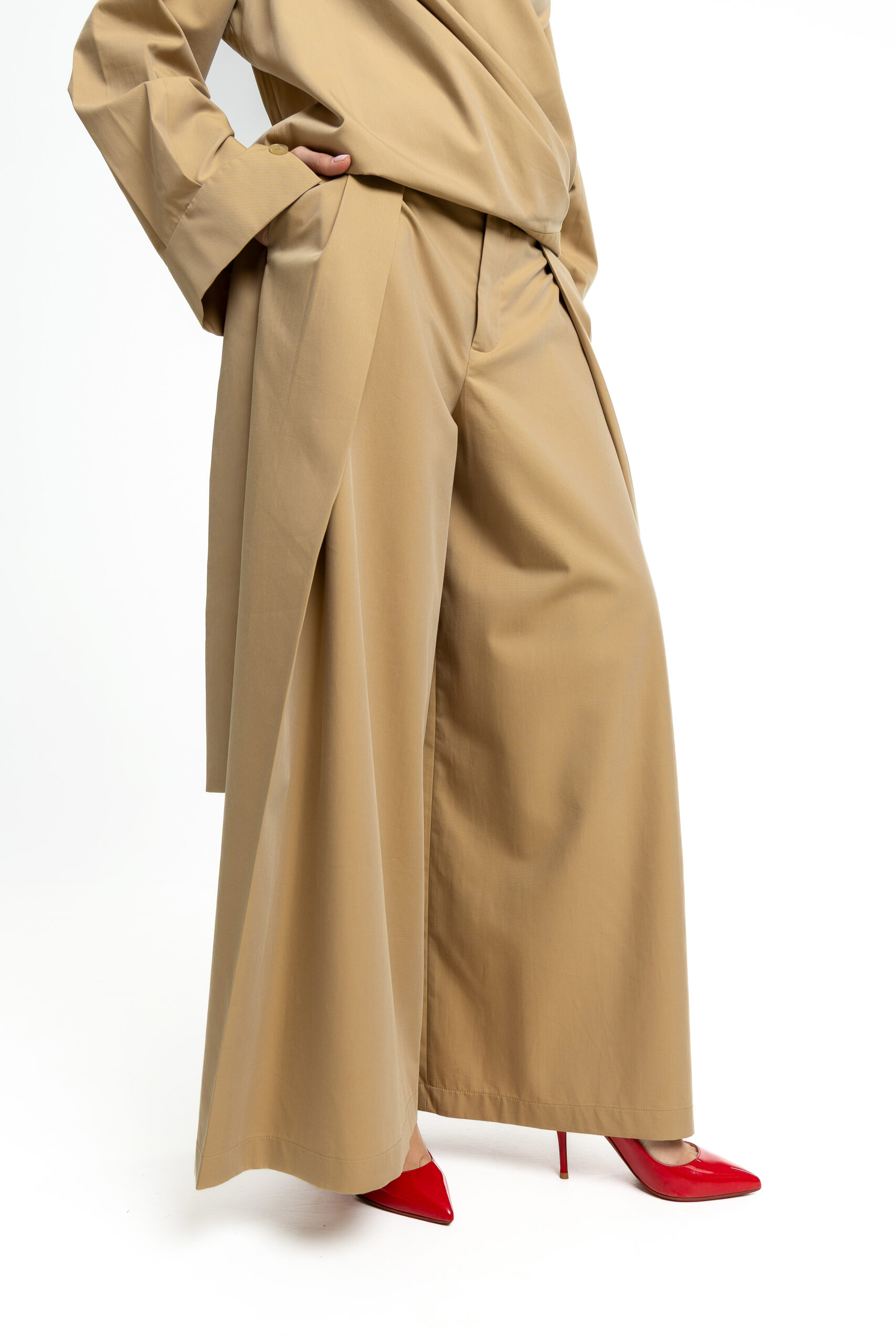 A high waist and deep front pleats form an elongated, architectural line while highlighting the natural fluidity of the fabric in motion.